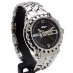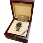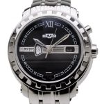 Dial: Black colour tone with sunray pattern. Silvered Roman numeral appliques. Date at 3 o’clock. Hours engraved on silvered central applique. Silvered flange with index appliques. Hands Hours and minutes: open-work hands in the shape of doubleedged swords
