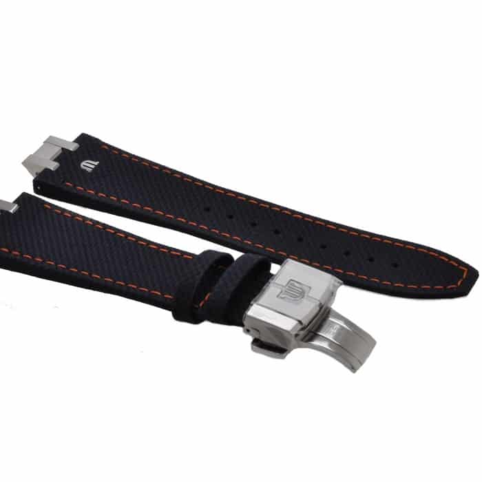 Strap: Stainless steel + blue calf leather with orange stitching