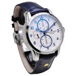 Dial: Silver with blue sub dials, luminous numerals and hands. Date on the 6
